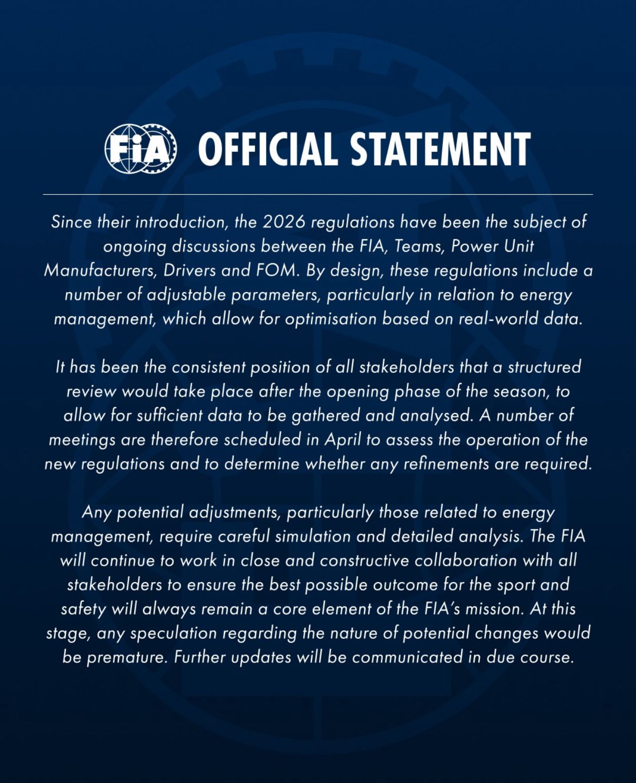 En ese sentido, la FIA remarcó que existe un plan estructurado para revisar el funcionamiento de estas regulaciones una vez completada la fase inicial del campeonato. "Todas las partes interesadas han mantenido la postura de que se llevaría a cabo una revisión estructurada tras el inicio de la temporada, para permitir recopilar y analizar suficientes datos”, indicó.