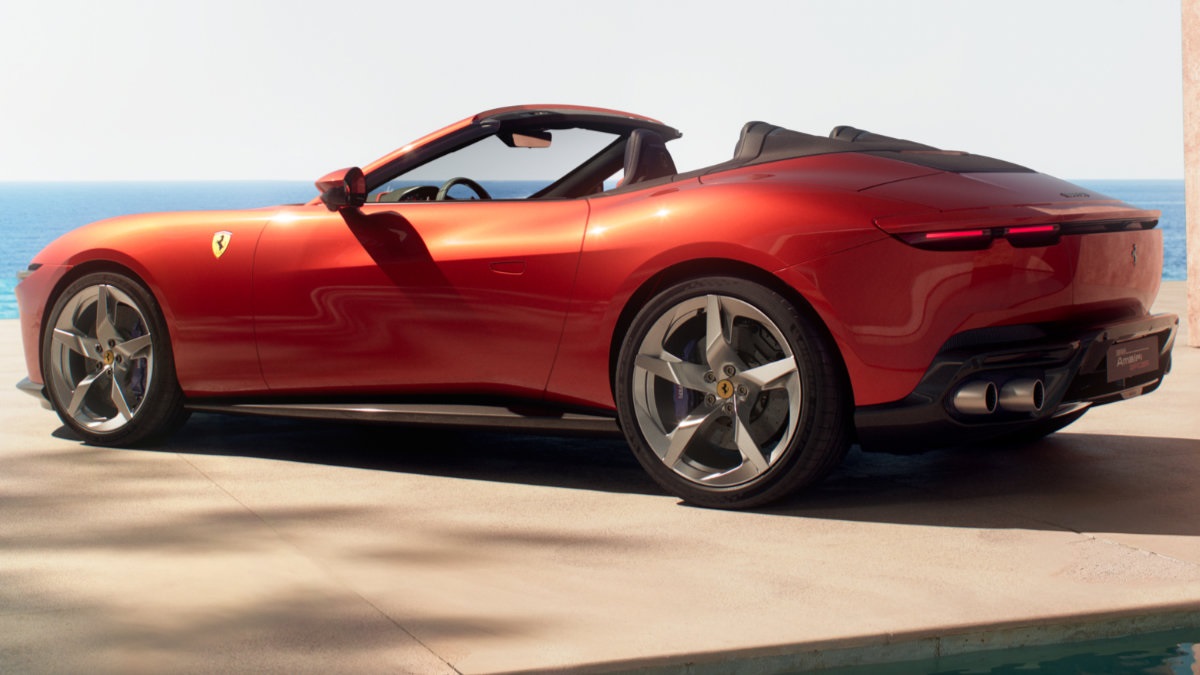 Diseño y Versatilidad a Cielo Abierto. Desarrollado por el Ferrari Design Studio bajo la dirección de Flavio Manzoni, el modelo mantiene la silueta minimalista del Amalfi original. Entre sus novedades visuales destaca el color exclusivo Rosso Tramonto, inspirado en los atardeceres de la costa amalfitana.