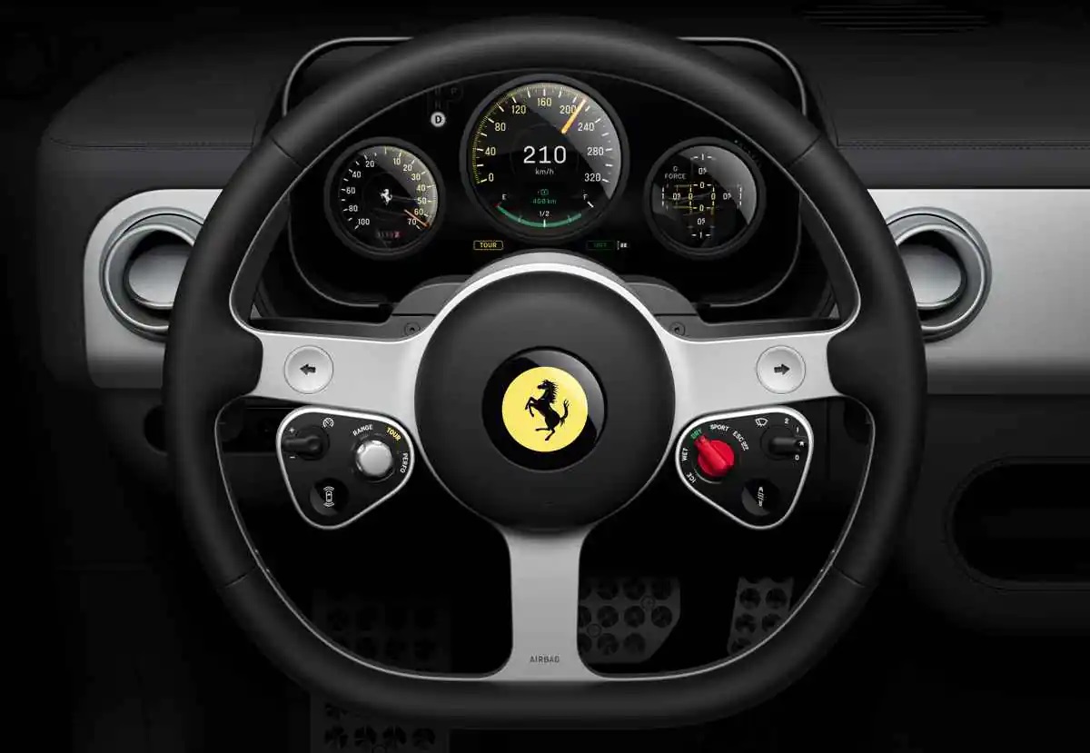 El puesto de conducción destaca por un volante completamente redondo de tres radios, inspirado en los Ferrari clásicos de los años 50 y 60, fabricado íntegramente en aluminio reciclado. Los botones físicos, con inspiración aeronáutica y de la Fórmula 1, priorizan la sensación mecánica y la precisión, logrando un equilibrio entre modernidad y herencia.