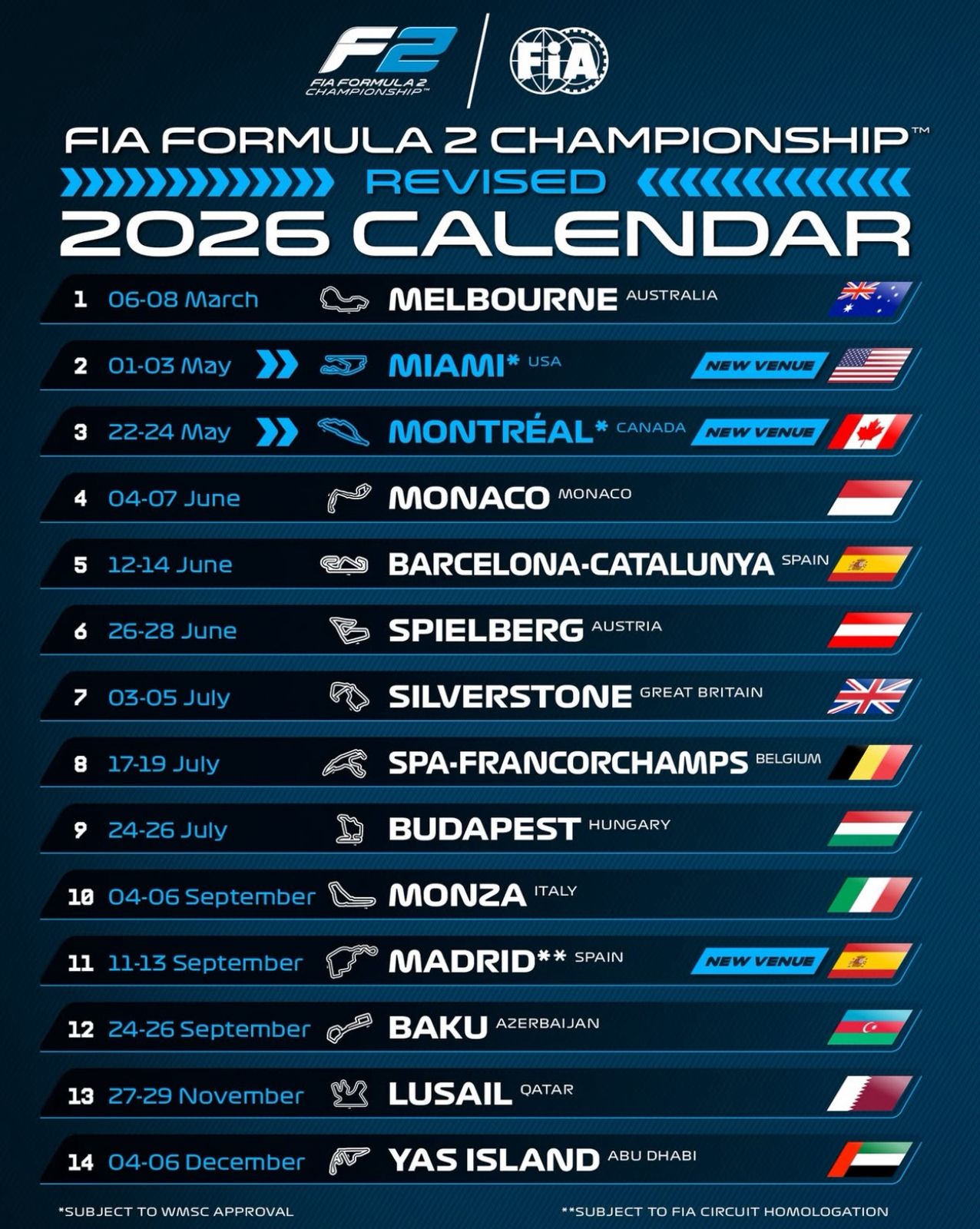 El presidente de la FIA, Mohammed Ben Sulayem, destacó la importancia de estos cambios dentro del campeonato: “Tras los cambios necesarios en el calendario al inicio de la temporada, la incorporación de estas nuevas rondas garantiza que el Campeonato de Fórmula 2 de la FIA se mantenga fuerte y equilibrado, y que pueda ofrecer grandes beneficios a nuestros equipos, pilotos y aficionados”.